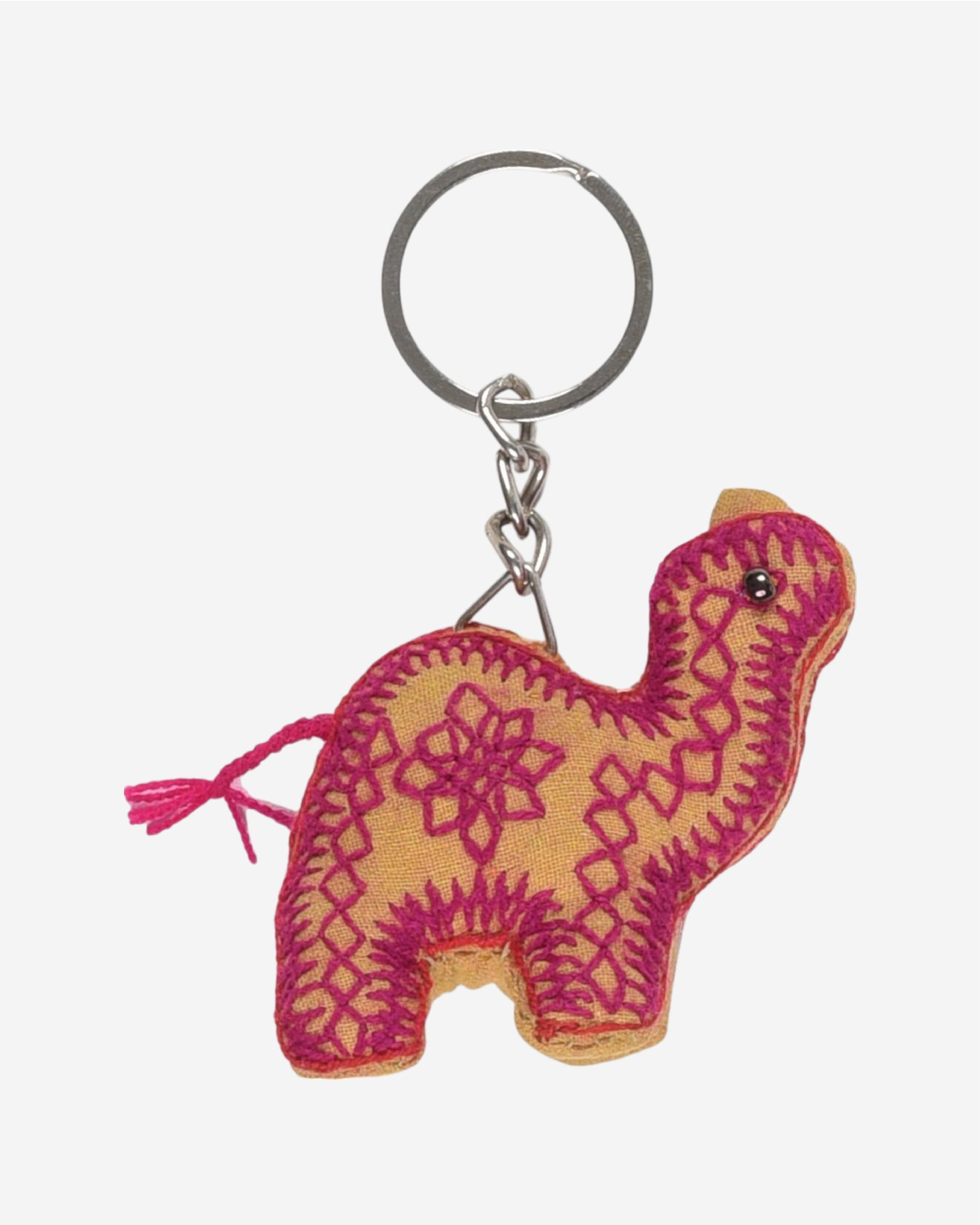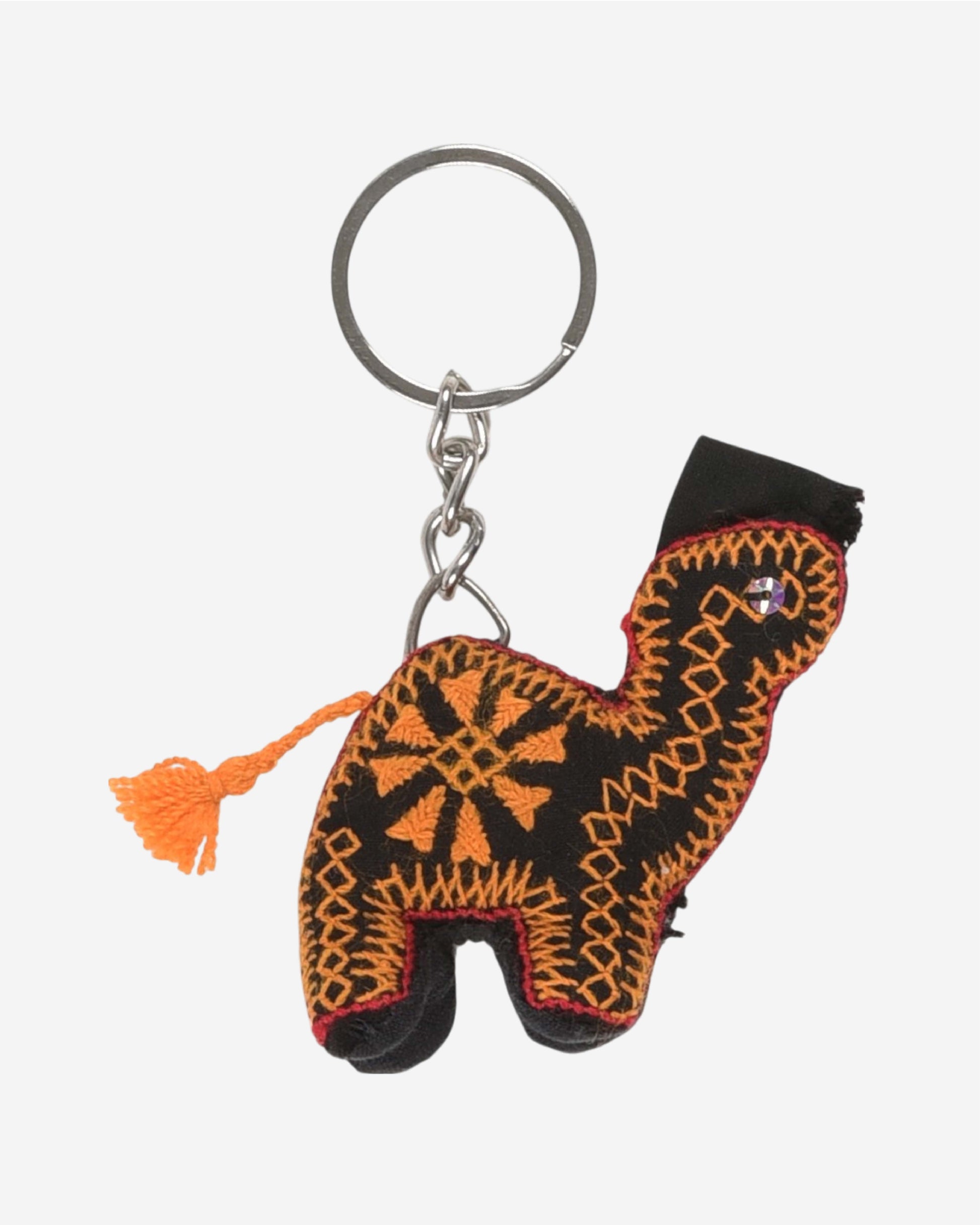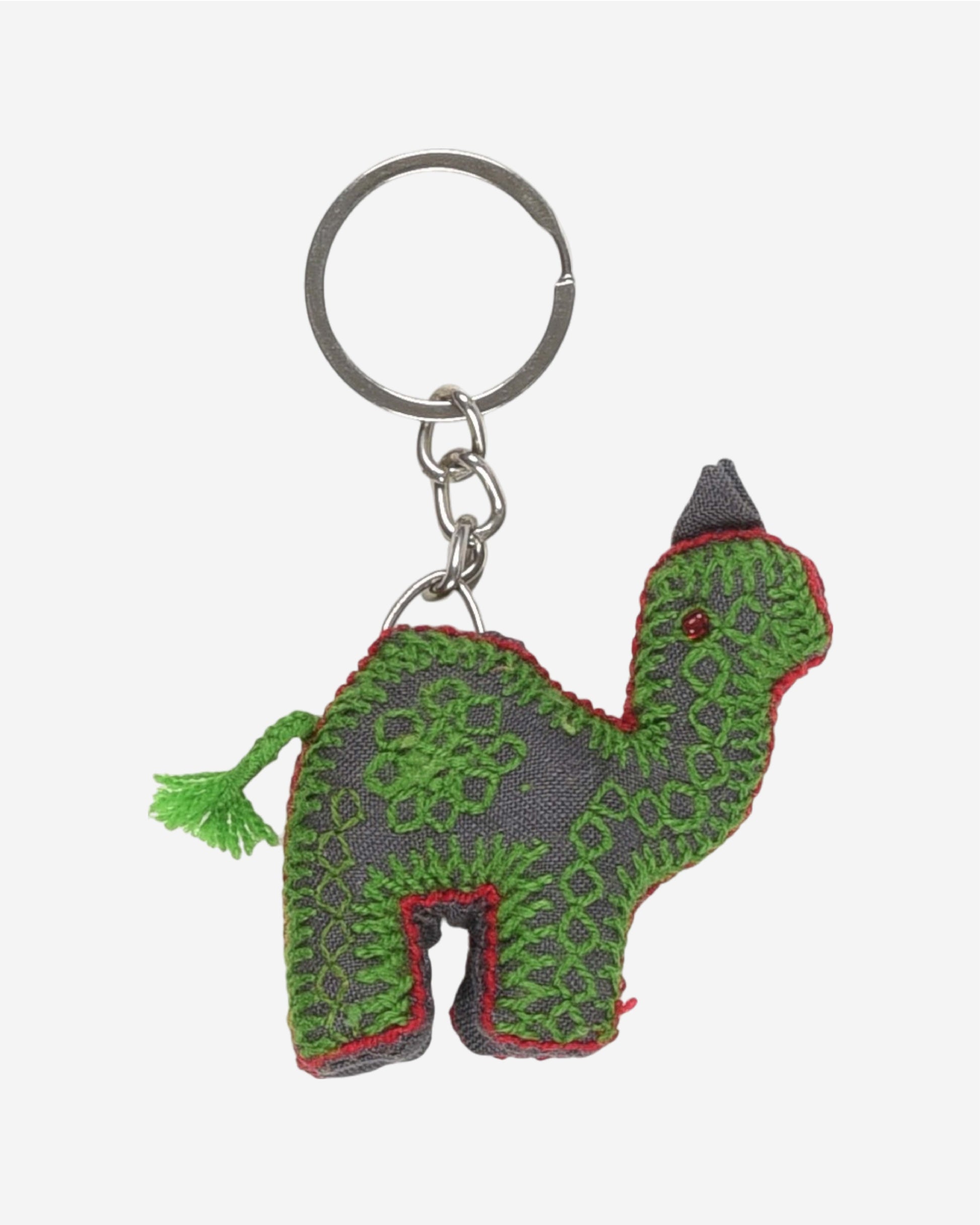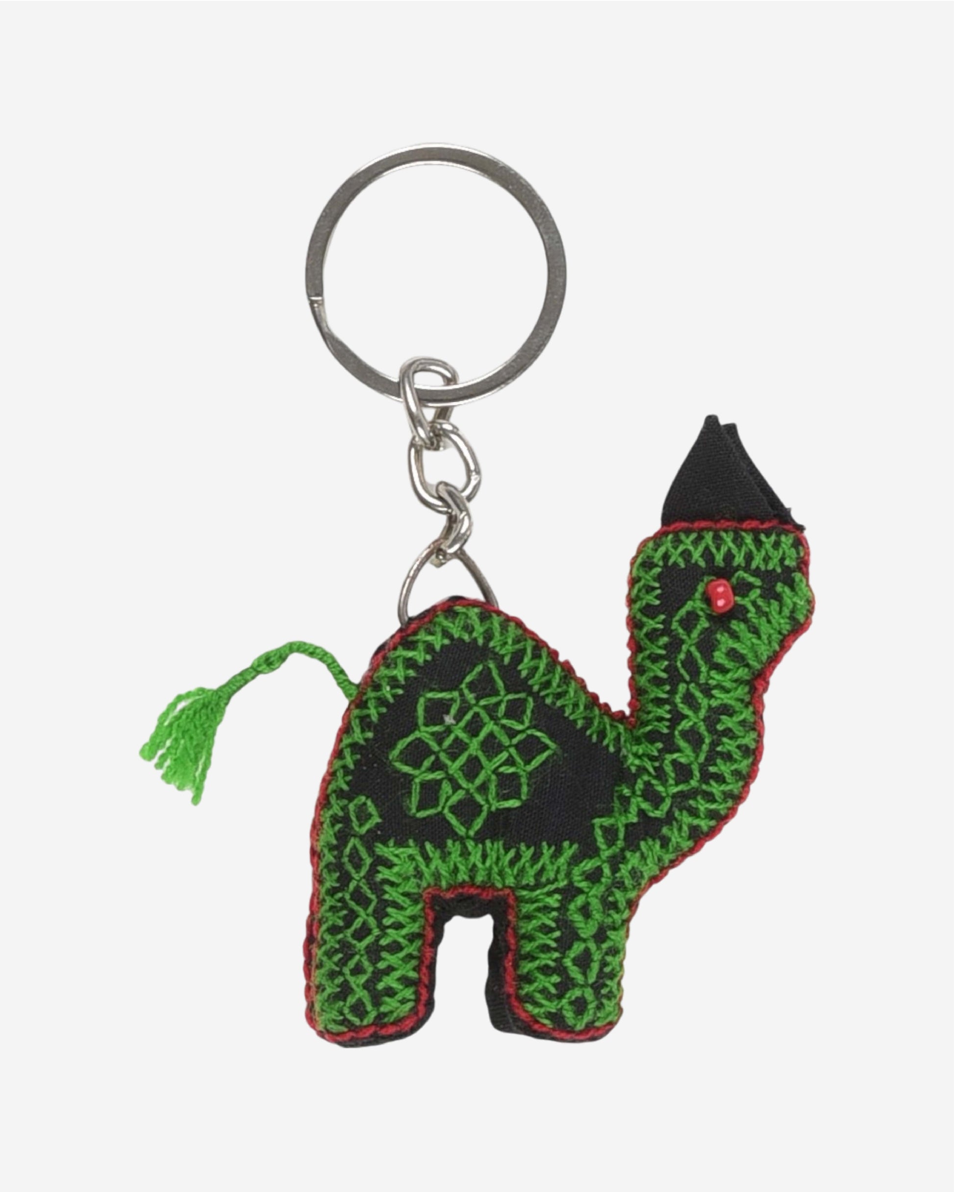 ہاتھ سے کڑھائی والی اونٹ کی شکل والی چابی کی چین نازک اور فنکارانہ ٹکڑے ہیں جو سندھ، پاکستان کی دیہی خواتین کاریگروں نے تیار کی ہیں۔ یہ چابی چین کاریگروں کو روایتی ہاتھ سے کڑھائی والی سوئی کے کام کی نمائش کرتے ہیں اور خطے کے امیر ثقافتی ورثے کی علامت کے طور پر کام کرتے ہیں۔ سندھ، پاکستان میں تربیت یافتہ دیہی خواتین کاریگر اکثر گھر سے کام کرتی ہیں، اپنی مہارت کو ہاتھ سے کڑھائی جیسے روایتی دستکاری میں استعمال کرتی ہیں۔ یہ خواتین SRSO سارتیون سانگ کے ذریعے خصوصی تربیت حاصل کرتی ہیں جو انہیں اپنی دستکاری کی مہارت کو بڑھانے میں مدد دیتی ہے۔