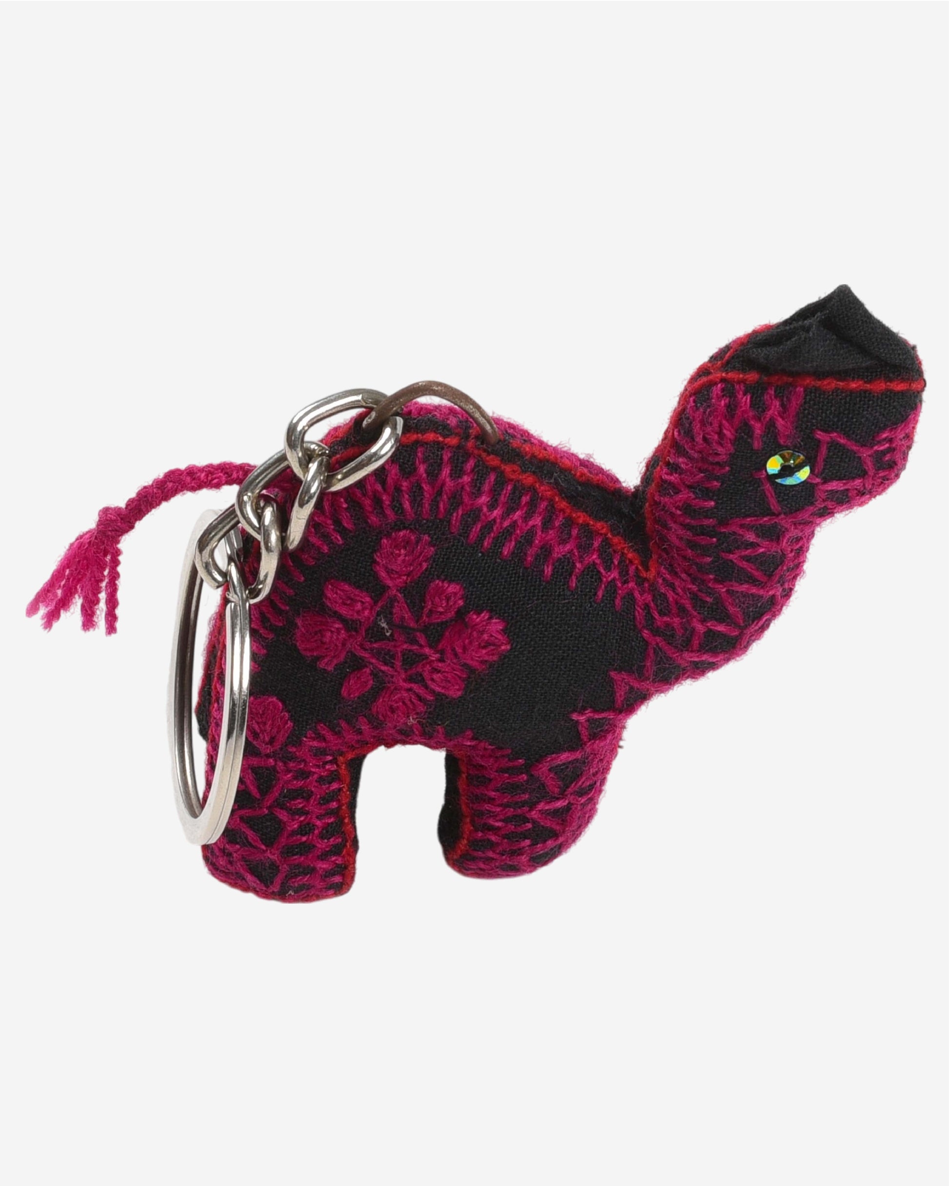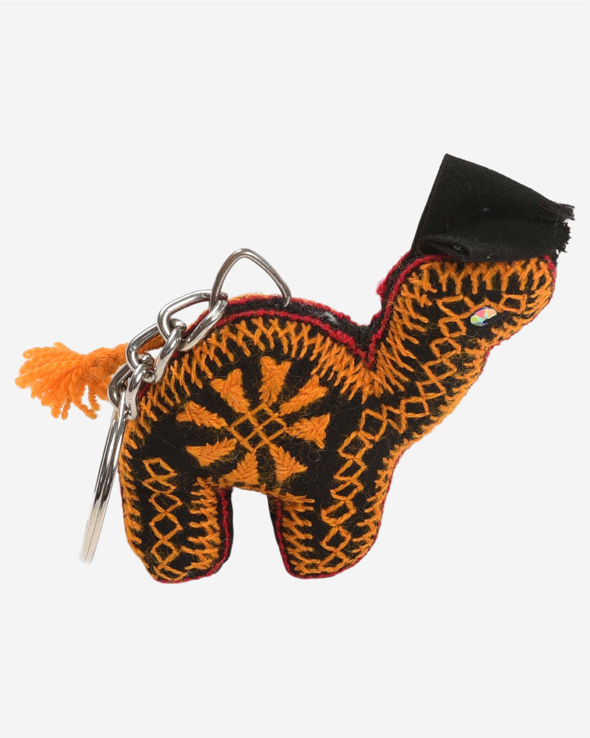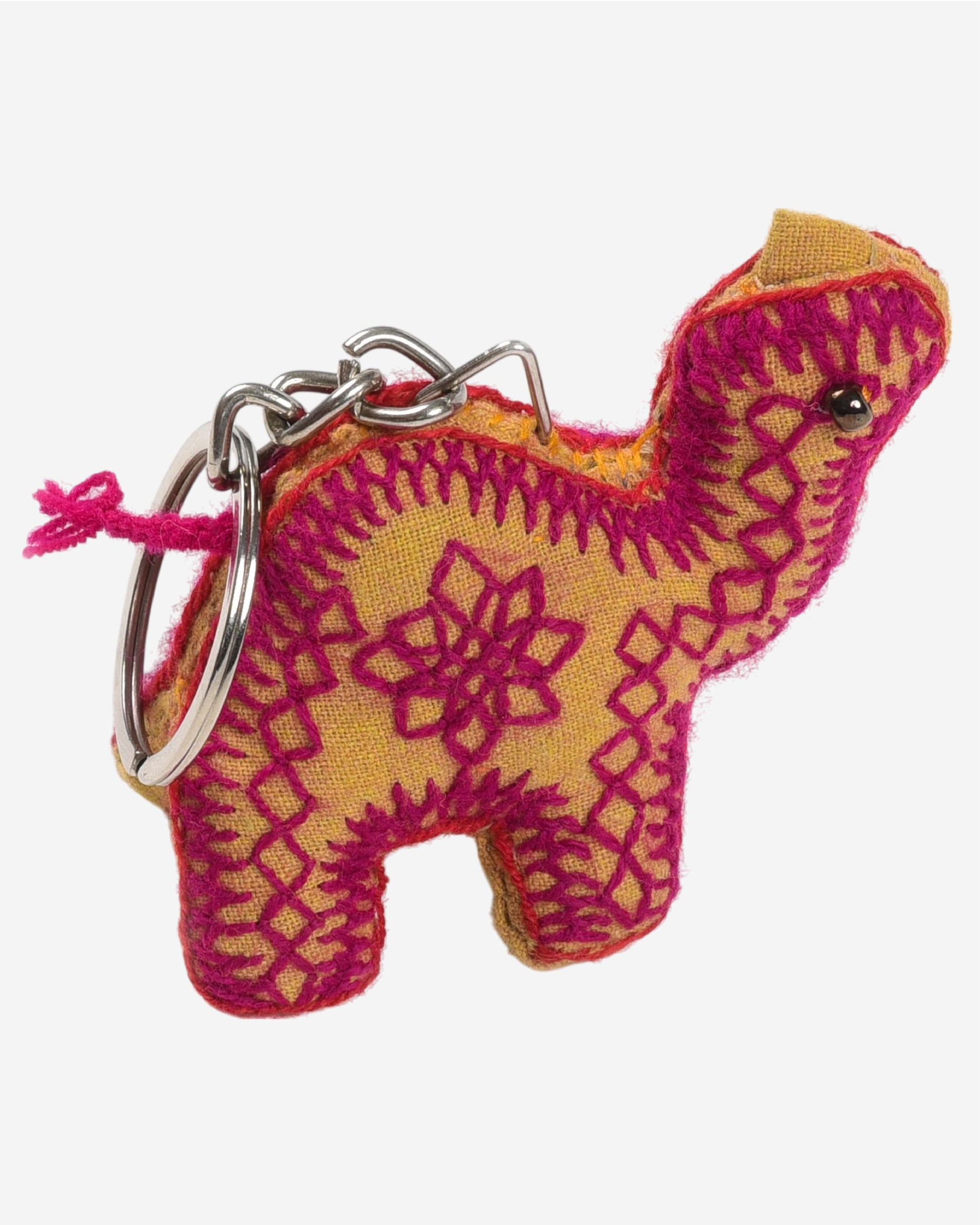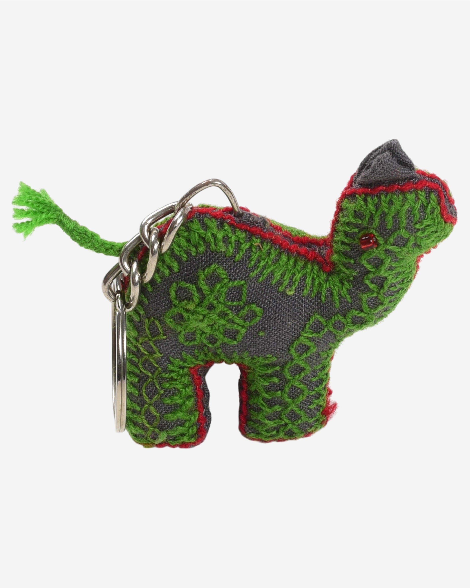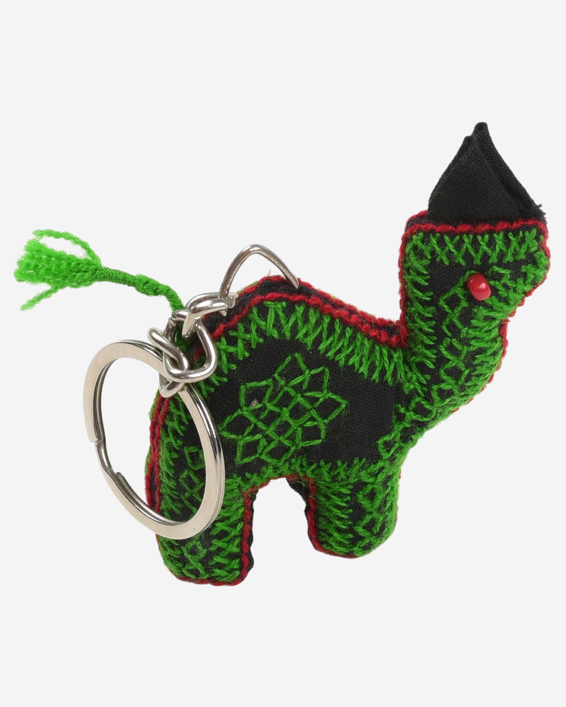 ہاتھ سے کڑھائی والی اونٹ کی شکل والی چابی کی چین نازک اور فنکارانہ ٹکڑے ہیں جو سندھ، پاکستان کی دیہی خواتین کاریگروں نے تیار کی ہیں۔ یہ چابی چین کاریگروں کو روایتی ہاتھ سے کڑھائی والی سوئی کے کام کی نمائش کرتے ہیں اور خطے کے امیر ثقافتی ورثے کی علامت کے طور پر کام کرتے ہیں۔ سندھ، پاکستان میں تربیت یافتہ دیہی خواتین کاریگر اکثر گھر سے کام کرتی ہیں، اپنی مہارت کو ہاتھ سے کڑھائی جیسے روایتی دستکاری میں استعمال کرتی ہیں۔ یہ خواتین SRSO سارتیون سانگ کے ذریعے خصوصی تربیت حاصل کرتی ہیں جو انہیں اپنی دستکاری کی مہارت کو بڑھانے میں مدد دیتی ہے۔